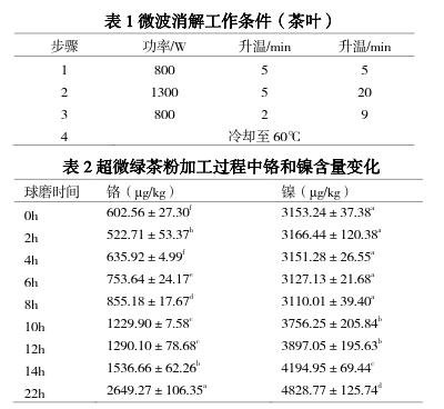 血[6];過(guò)量的鎳可引起炎癥、癌癥、癥、系統(tǒng)紊亂、降低生育能力、致畸和致突變等[7];鉻雖是人體必需的微量元素,但高鉻的食用也會(huì)引起不適[8]。超微綠茶粉是將達(dá)到綠色標(biāo)準(zhǔn)的綠茶茶葉,經(jīng)超微粉碎形成 200 目(74μm)甚至達(dá)到 1000 目(12μm)以上的綠茶超微細(xì)粉[9-10]?,F(xiàn)階段我國(guó)企業(yè)大多采用球磨方式加工超微綠茶粉,在球磨加工過(guò)程中,茶葉被粉碎的同時(shí),研磨材料本身也會(huì)發(fā)生變化,從而可能給超微綠茶粉帶來(lái)重金屬污染。另外,與傳統(tǒng)茶葉不同的是,超微綠茶粉屬于茶葉深加工范疇,常被以全組分形式加入到食品和化妝品中[11],又因其中的重金屬元素應(yīng)滿足《食品標(biāo)準(zhǔn)食品中污染物限量》和《茶葉中鉻、鎘、汞、砷及氟化物限量》對(duì)茶葉中重金屬限量要求[12-13],因此應(yīng)對(duì)超微綠茶粉加工過(guò)程中重金屬污染給予關(guān)注,但目前對(duì)超微綠茶粉加工過(guò)程中的重金屬含量變化未見報(bào)道。本文對(duì)球磨加工過(guò)程中超微綠茶粉的重金屬含量進(jìn)行檢測(cè)分析,同時(shí),采用三組球磨材料不銹鋼球-不銹鋼罐、氧化鋯球-不銹鋼罐、瑪瑙球-尼龍罐對(duì)超微綠茶粉進(jìn)行加工,通過(guò)重金屬元素鉻和鎳的檢測(cè),并結(jié)合粒徑分析,為尋找合適的球磨材料提供依據(jù)。